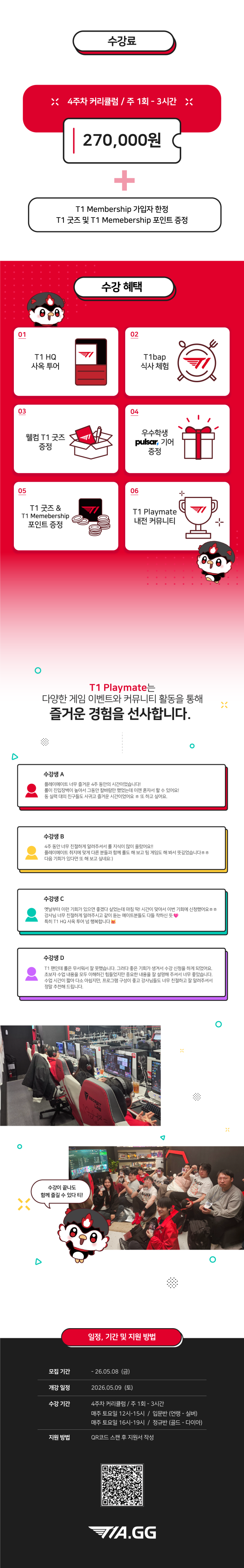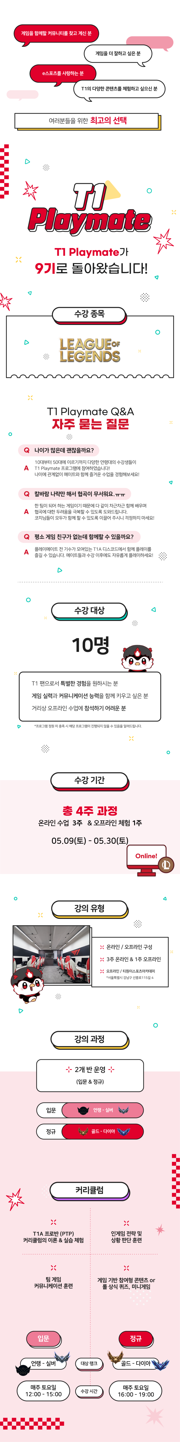 T1 Playmate 9기 최고관리자 2026-04-17 최고관리자 0 6 2시간전 T1 Playmate 9기 신청은 'T1 Playmate 신청서'를 작성해주세요. < 수강 신청 하러 가기 > https://forms.gle/AXQTCX326UTaNR4E6