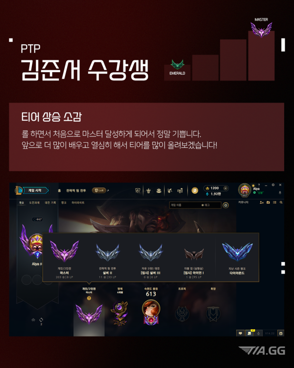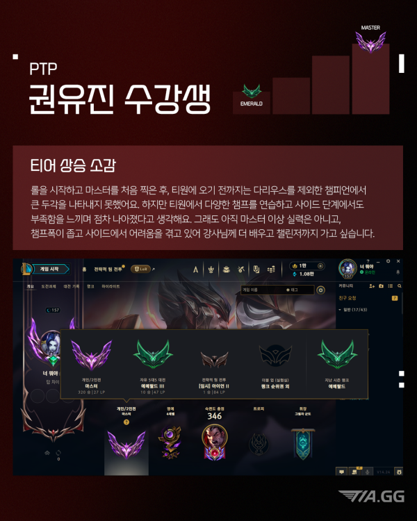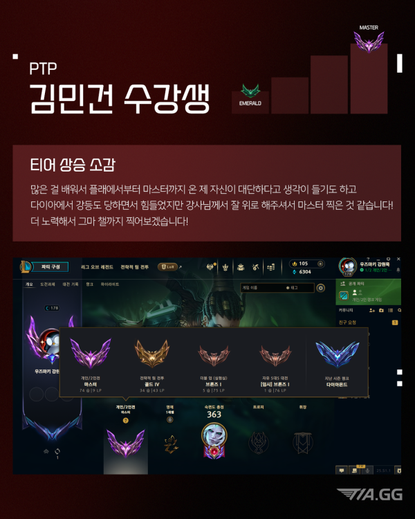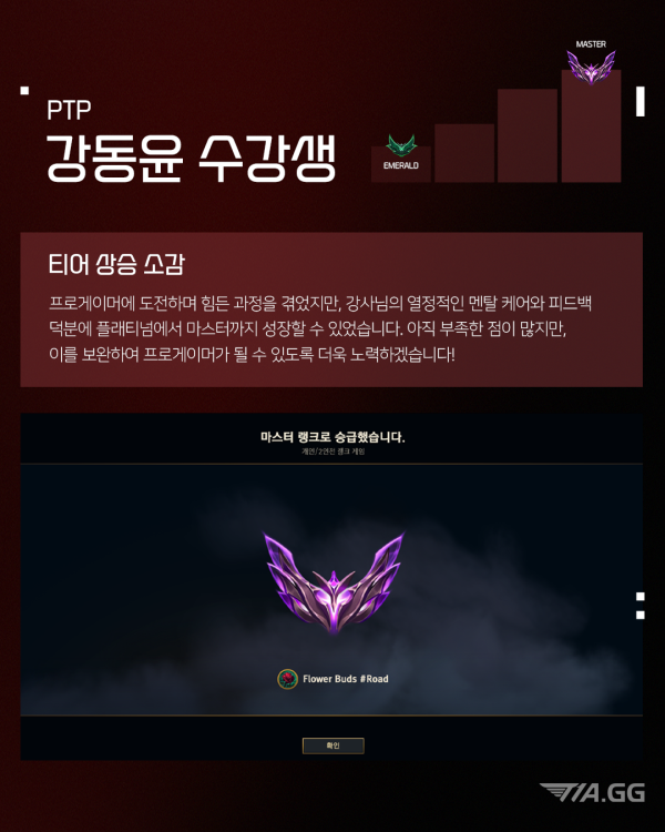 T1A 2월 마스터 달성 재원생 최고관리자 2025-02-11 최고관리자 0 907 02.11 15:10 T1A 롤 PTP 김준서, 권유진, 강동윤, 김민건 수강생이 마스터를 달성했습니다! 이 순간을 즐기고, 더 높은 곳으로 T1A 수강생들의 티어 달성 소감과 앞으로의 각오, 지금 바로 확인해 보세요.