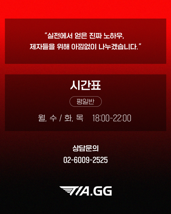 월즈 챔피언 ’PIGLET‘에게 직접 배우는 롤 프로반 최고관리자 2025-03-31 최고관리자 0 904 03.31 16:46 월즈 챔피언 ’PIGLET‘에게 직접 배우는 롤 프로반! 리그오브레전드 프로게이머를 꿈꾼다면? PTP [Path to Pro] 지금 바로 신청하세요! 수업 시간표 평일반: 월,수 / 화,목 18:00–22:00 (주 2회) 신청서 작성은 수강신청을 클릭해 주세요