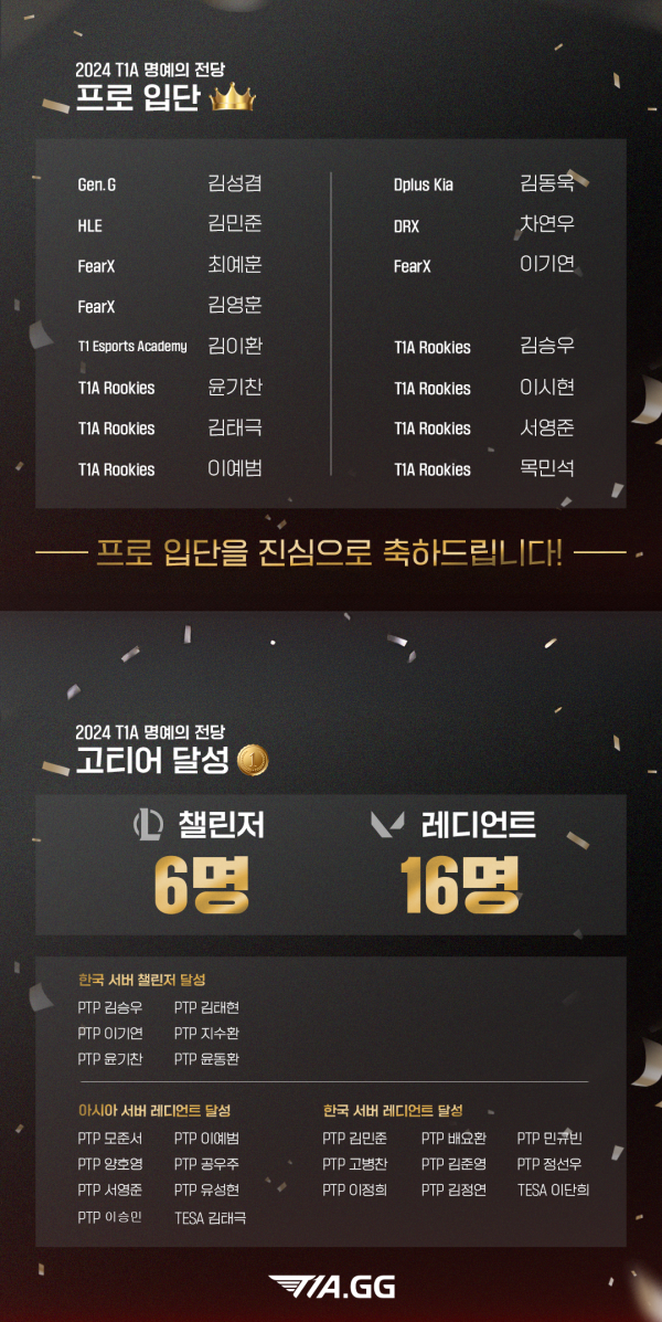 2024년도 T1A 명예의 전당 프로게이머 데뷔 & 고티어 달성 최고관리자 2025-01-03 최고관리자 0 1185 01.03 14:09 2024년 프로 준비의 최고의 선택, T1 Esports Academy 프로게이머 15명 배출 챌린저 6명 달성 레디언트 17명 달성 프로를 꿈꾸는 당신을 위한 완벽한 시작점, T1 Esports Academy! 꿈을 현실로 만들고 싶다면, 지금 바로 도전하세요!