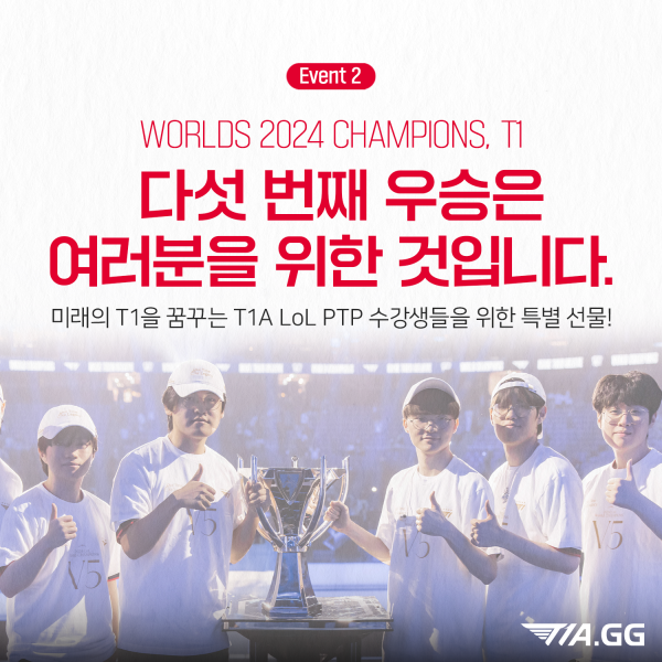 [T1A] Worlds 2024 T1 우승 기념 재원생 EVENT 02 최고관리자 2024-11-15 최고관리자 0 1098 2024.11.15 14:59 [T1A] Worlds 2024 T1 우승 기념 재원생 EVENT 02