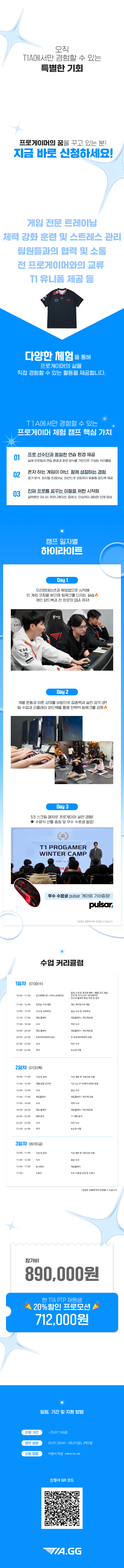 T1A 롤 프로게이머 체험 여름 캠프 최고관리자 2025-06-25 최고관리자 0 1634 06.25 19:37 T1A 롤 프로게이머 체험 여름 캠프 신청은 수강신청을 클릭해주세요.