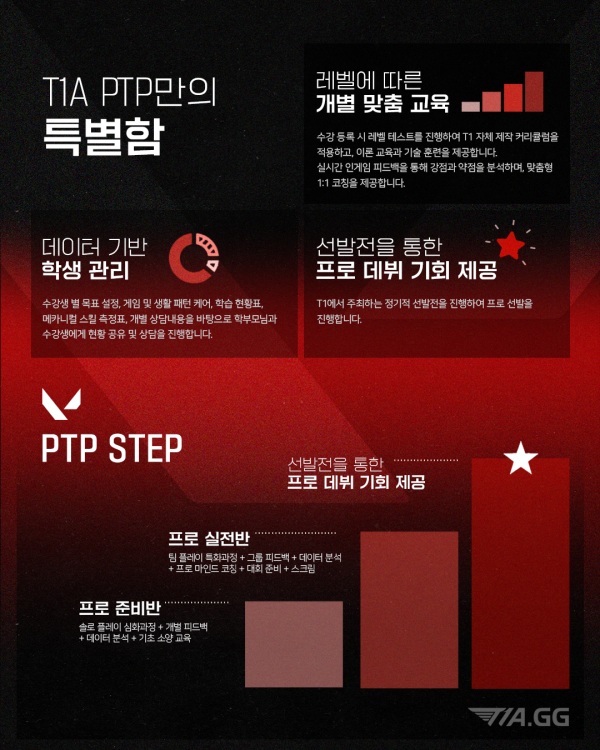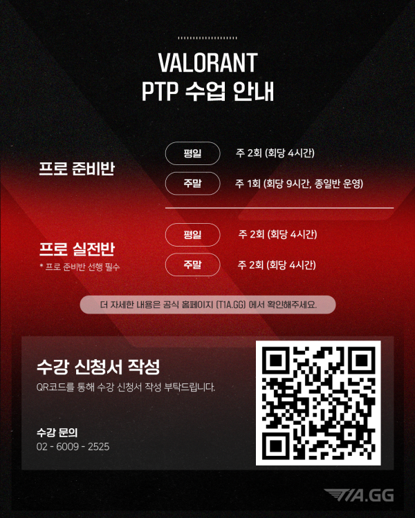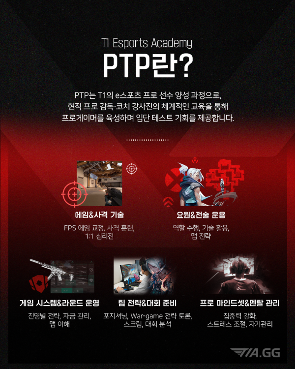 T1A의 발로란트 프로 선수 양성 과정, PTP [Path to Pro] 최고관리자 2025-08-21 최고관리자 0 1235 08.21 17:54 프로게이머가 되는 가장 확실한 길, T1 Esports Academy! T1A의 프로 선수 양성 과정, PTP [Path to Pro] - 현직 프로 감독 & 코치가 직접 지도하는 프로 육성 교육 - 최고 수준의 커리큘럼 & 1:1 맞춤형 피드백 - T1 입단 테스트 기회 제공 발로란트 프로게이머를 꿈꾼다면, 확실한 선택은 오직 PTP PTP 신청은 수강신청을 클릭해주세요.