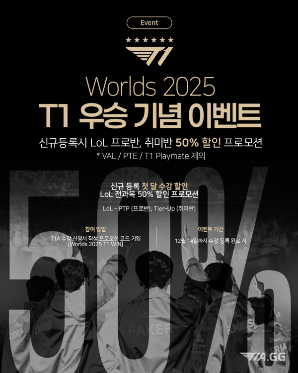 Worlds 2025 T1 우승 기념 이벤트 최고관리자 2025-11-11 최고관리자 0 253 11.11 11:21 2025 T1 우승 기념 이벤트 LoL 프로반, 취미반 50% 할인 이벤트 기간 12월 14일까지 수강 등록 완료 시 참여 방법 수강 신청서 작성 - 프로모션 코드 기입 필수 프로모션 코드 [Worlds 2025 T1 WIN] ⠀ 카카오톡 문의 : @티원이스포츠아카데미 *PTE / T1 Playmate / VALORANT 클래스 제외 *T1A 수강 이력이 없는 신규 등록자에게만 적용되는 프로모션입니다.